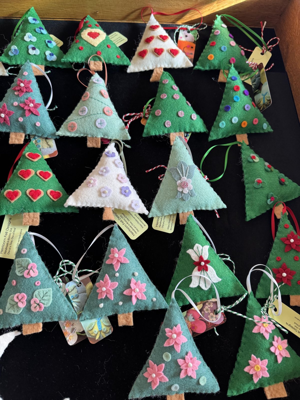 Additional materials, as well as an assortment of wool felt sheets, cut designs and embroidery floss will be available for sale, along with kits, finished ornaments and pincushions from Heirloom Felt Designs.